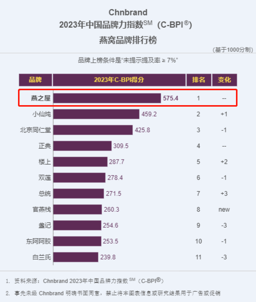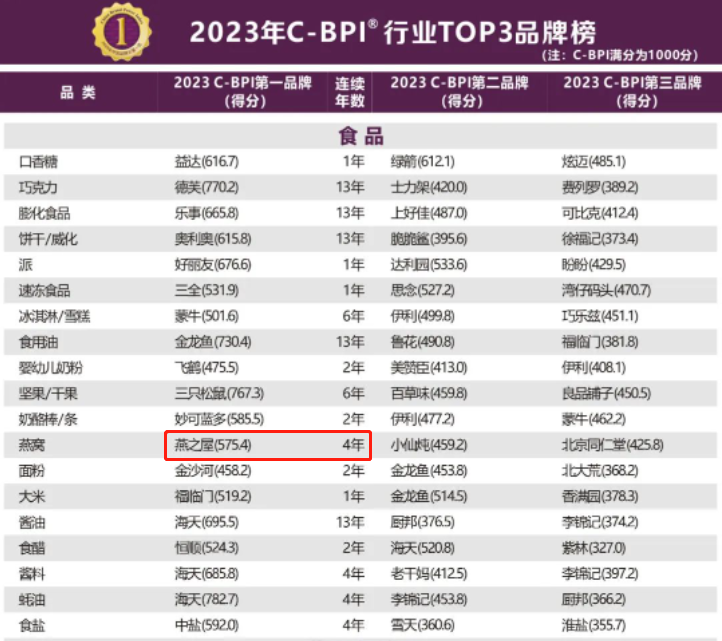 圖:燕之屋榮登2023年(第十三屆)中國(guó)品牌力指數(shù)SM(C-BPI®)燕窩品類排行榜第一