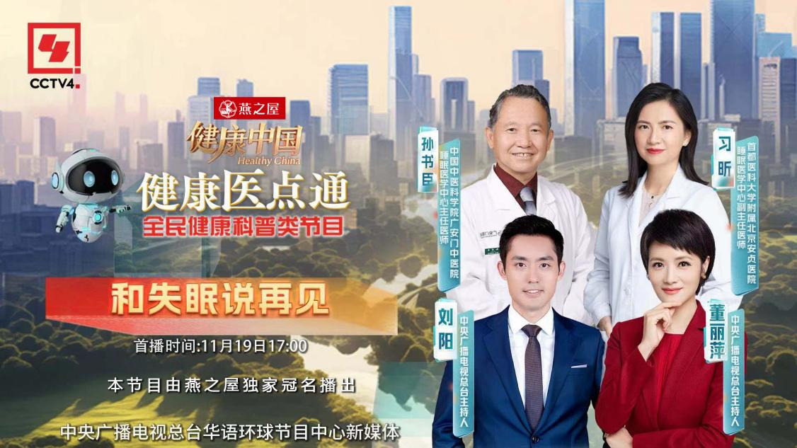 本期,由燕之屋獨家冠名的CCTV-4大型健康類欄目《健康中國》邀請來自首都醫(yī)科大學(xué)附屬北京安貞醫(yī)院睡眠醫(yī)學(xué)中心的副主任醫(yī)師習(xí)昕,為觀眾解讀失眠的定義,帶領(lǐng)大家一起了解失眠對身體的危害,傳授失眠的解決辦法,相約《不在天亮說晚安》。