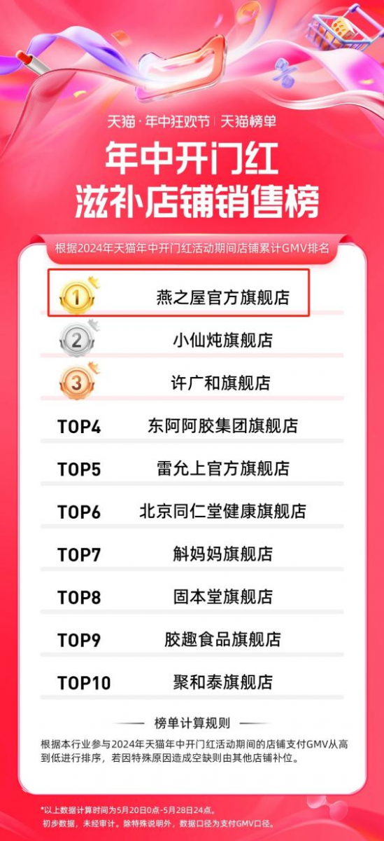 隨著618大幕拉開,第一波戰(zhàn)報火熱出爐。據(jù)阿里健康發(fā)布的2024年天貓年中開門紅健康行業(yè)成績單顯示,燕之屋官方旗艦店榮登滋補(bǔ)店鋪銷售榜第一、健康行業(yè)店鋪銷售榜第二,展現(xiàn)了燕之屋在品牌年輕化戰(zhàn)略中的深度思考和實踐能力。